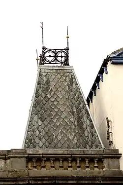 This is a Grade II listed building.[38] The building has a "handsome Italian Renaissance stone frontage",[37] a symmetrical arrangement of five bays with round-arched windows and a projecting entrance bay in the centre. The entrance is a Corinthian portico, with a tympanum above, carrying the borough arms, and the doorway has a fanlight within its arch.[38] This western façade on Swan Road was added, along with a general rebuild, between 1874 and 1876 by architect Arthur Hiscoe.[nb 1][37] The entrance is "flanked by attached columns and a handsome entablature enriched with symbols of the locality".[37] It has a slated, hipped roof and a parapet with balustrades. Two high pavilions, "with steep ashlar fishtail slate roofs of French type with ornamental cast iron crestings",[38] were designed by Hiscoe. The pavilions have "Corinthian pilasters carrying continuous entablature".[38] Incorporated with the back of the building, and forming a south-east wing attached to the back of the main hall, is an old, three-storey house. It dates from the early 19th-century, and is constructed of squared, coursed gritstone rubble, with three sash windows and a door.[38]