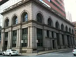 The Merchants' National Bank Building (1895), Baltimore was a historic bank building at 301 Water Street, at the corner of South Street, in Baltimore, Maryland. It was a 7-story, Renaissance Revival style building designed by the Baltimore-based architectural firm of Baldwin & Pennington, and constructed in 1893-1895. Johns Hopkins, a Baltimore businessman, abolitionist, and philanthropist, had been president of the bank from 1853 until his death in 1873.[2][3]