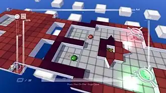 The mercury blob can be split up into multiple blobs using sharp corners of the stages and can be remerged by making contact with each other or remerge instantly with a press of a button, however, using the latter method will cost players a few seconds.[3] The blob of mercury can change color by moving under Paintshops or merging with other blobs of mercury of different colors. Stages feature color-dependent tiles that activate pathways toward goalpost and tiles are blocked by invisible barriers unless the mercury is a specific color.[4]