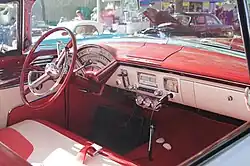 For 1955, Mercury redesigned its model line, adding the Montclair as a premium sedan line above the Monterey.[3] Alongside a four-door sedan (sharing a different roofline from the Monterey), the Montclair was introduced in a two-door hardtop and two-door convertible configuration.[4] As a styling feature, the Montclair received a color-contrast panel below the window line (typically color-coordinated with the roof).[3] A 292 cubic-inch V8 adopted from the new Ford Thunderbird roadster produced 195 hp; along with a 3-speed manual transmission, a 3-speed automatic was offered as an option.[5][1] The listed retail price for the 1955 2-door Hardtop Coupe was US$2,631 ($30,882 in 2024 dollars [6]) and sold 71,588. Standard equipment included cloth and vinyl upholstery, full interior carpeting, and chrome window surround mouldings; among the options were a heater and windshield defroster, radio, power adjustable front seat, power windows, power steering, power brakes and auxiliary road lamps.[1]