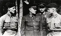 In November 1939, at the start of the Winter War, Meretskov initially ran the overall operation against the Finns.[3] However, gross underestimations of the Finnish defenses, the size of their forces and the corresponding overestimations of the capacity of the Red Army, led to serious planning flaws. Only five rifle divisions were initially sent to assault the Mannerheim Line and piecemeal commitment of reinforcements did not achieve any effect.[4] Meretskov failed and the command was passed on 9 December 1939 to the General Staff Supreme Command, Stavka, directly under Kliment Voroshilov (chairman), Nikolai Kuznetsov, Joseph Stalin and Boris Shaposhnikov.[5][6]
