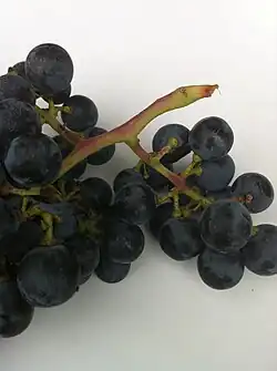 Merlot grapes are identified by their loose bunches of large berries. The color has less of a blue/black hue than Cabernet Sauvignon grapes and with a thinner skin and fewer tannins per unit volume. It normally ripens up to two weeks earlier than Cabernet Sauvignon. Also compared to Cabernet, Merlot grapes tend to have a higher sugar content and lower malic acid.[7] Ampelographer J.M. Boursiquot has noted that Merlot has seemed to inherit some of the best characteristics from its parent varieties—its fertility and easy ripening ability from Magdeleine Noire des Charentes and its color, tannin and flavor phenolic potential from Cabernet Franc.[1]