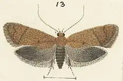 ♂. 12 mm. Head and palpi brownish. Antennal ciliations 3. Thorax fuscous. Abdomen grey. Forewings elongate, costa slightly arched, apex obtuse-pointed, termen very obliquely rounded; fuscous; stigmata obscure, dark grey, plical rather obliquely beyond first discal, an obscure ochreous-whitish dot beneath second discal : cilia light fuscous. Hindwings rather dark grey; cilia light grey, with darker subbasal shade.[6]