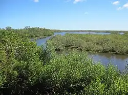 Merritt Island National Wildlife Refuge is located due east of Titusville on Merritt Island in Brevard County, Florida, and occupies 140,000 acres (570 km2), overlaid with the Kennedy Space Center. To the north, it borders on the Canaveral National Seashore; to the south it encompasses non-public portions of the Kennedy Space Center (with which it also shares some history), which in turn abuts Cape Canaveral Space Force Station. Mosquito Lagoon and the Indian River run through the refuge.[1] Since public access to all these areas is controlled in various ways, the refuge is part of a very substantial area of relatively undisturbed wildlife habitat.