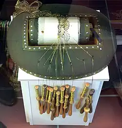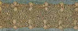 Lace made using gold wire has been produced since antiquity, with examples of gold netting found in Egyptian and Assyrian tombs from 1500 to 1000 BCE.[1] It was mainly produced as an embellishment for religious vestments and high status garments.[1] Metal lace, including gold and silver point de Venise, was produced in Italy until the 15th century, when high taxation and sumptuary laws led to textile threads such as linen replacing the use of metal.[1] To avoid these costs, the production of metal lace moved to France, where a high demand by royalty and the French aristocracy led to Arras, Aurillac and other locations becoming renowned for gold lace production.[1] From the 15th century on, most metal lace was a combination of metal and textile threads, rather than made of pure metal.[1]