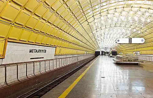 Metalurhiv (Ukrainian: Металургів) is a station on Dnipro Metro's Tsentralno–Zavodska Line. It is a single-vault deep subway station, accessible only by an escalator and was opened on 29 December 1995 along with the rest of the system's first stations. The station is located on the Serhiy Nigoyan Avenue, near the Organ music centre. The station is named Metalurhiv for the steel-makers of the city and metallurgical plant located nearby.