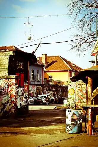 Squatters represent the heart of the matter of legality and formality in Metelkova: the autonomous part is considered to be in a legal and administrative limbo defined through tolerance and legitimization toward city's authority.[2] A possible explanation for this situation is to be found in the nature of the squatting in Metelkova: in fact the old buildings of the Yugoslav army are not occupied for the sole purpose of living there, but also for the aim of producing culture.[8] From this perspective, it is possible to determine the beginning of the tolerance: since 1997, when Ljubljana was designated as the European Capital of Culture, Metelkova stopped hosting permanent residents, following an agreement reached with the municipality, whereby the city decided to dedicate the Metelkova buildings to the promotion of culture and art.[6]