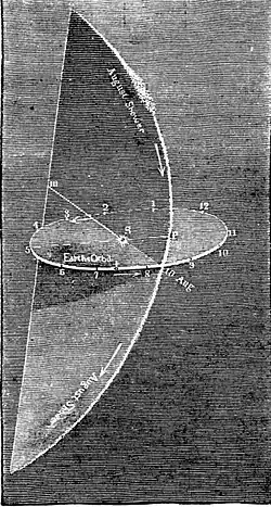 The Italian astronomer Giovanni Schiaparelli ascertained the relation between meteors and comets in a series of letters to Angelo Secchi late in 1866. He was able to demonstrate that the Leonid meteor shower shared the same orbit as the Comet Tempel.[19][5] Biela's Comet, discovered in 1772 and identified as periodic in 1826, was observed to have two components in 1846. During the 1852 return, both components were fainter and had a greater separation. In 1868, Edmund Weiss determined that the Earth would intersect the orbit of this comet in 1872, and a strong meteor shower was observed at that time. This meteor stream, now referred to as the Andromedids, further established the connection between comets and meteor showers.[20]