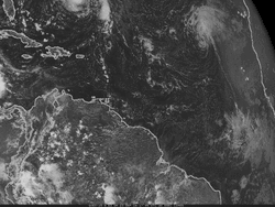 On September 22–23, a vigorous tropical wave, embedded within the monsoon trough, exited the west coast of Africa over the Atlantic Ocean near Guinea Bissau.[1][2][3] The wave coincided with an upper-level trough and an isolated plume of moisture; however, little convection was present.[4] Located unusually close to the equator, roughly 8–10°N,[1] the system was unable to acquire significant spin via the Coriolis force and struggled to develop as it moved rapidly west at 25–30 mph (40–48 km/h).[1][5] Despite this, the three top forecast models for hurricanes—the GFS, ECMWF, and UKMET—indicated the system would likely become a tropical cyclone over the Caribbean.[5] Two days later, the wave passed south of Cape Verde,[6] and was assessed as having a high probability of tropical cyclogenesis within five days by the National Hurricane Center (NHC).[7] With environmental conditions favoring slow development, thunderstorm activity increased along the wave on September 25,[8] which organized more during the subsequent days while approaching the Lesser Antilles.[9]