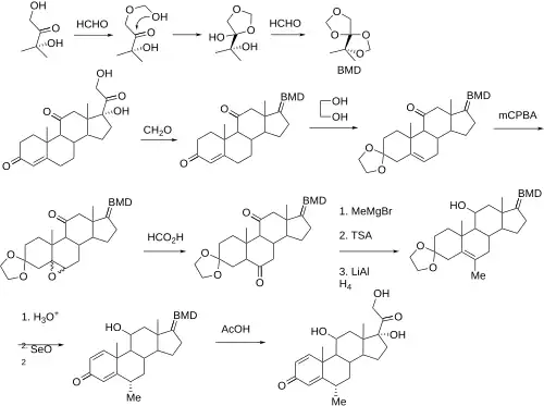 Methylprednisolone, or 6α-methylprednisolone, also known as 11β,17,21-trihydroxy-6α-methylpregna-1,4-diene-3,20-dione, is a synthetic pregnane steroid and a derivative of hydrocortisone (11β,17α,21-trihydroxypregn-4-ene-3,20-dione) and prednisolone (11β,17α,21-trihydroxypregn-1,4-diene-3,20-dione).[41][42] A variety of methylprednisolone esters with differing characteristics exist and have been marketed for medical use.[41][42] They include methylprednisolone aceponate (Advantan), methylprednisolone acetate (Depo-Medrol), methylprednisolone succinate (Solu-Medrol), and methylprednisolone suleptanate (Medrosol, Promedrol).[41][42]