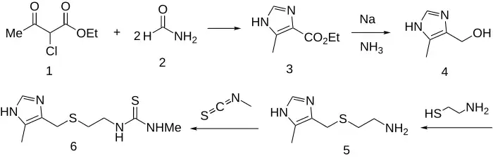 Reacting ethyl 2-chloroacetoacetate (1) with 2 molar equivalents of formamide (2) gives 4-carboethoxy-5-methylimidazole (3). Reduction of the carboxylic ester (3) with sodium in liquid ammonia via Birch reduction gives the corresponding alcohol (4). Reaction of that with cysteamine (mercaptoethylamine), as its hydrochloride, leads to intermediate 5. In the strongly acid medium, the amine is completely protonated; this allows the thiol to express its nucleophilicity without competition and the acid also activates the alcoholic function toward displacement. Finally, condensation of the amine with methyl isothiocyanate gives metiamide (6).