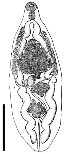| Drawing of ventral view of Metorchis conjunctus, scale bar is 1 mm | |