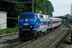 Diesel trains into Grand Central use General Electric P32AC-DM electro-diesel locomotives capable of switching to a pure electric mode. These locomotives have contact shoes compatible with Metro-North's under-running 750 V DC third rail power distribution system. Shoreliner series coaches are used in push-pull operation.