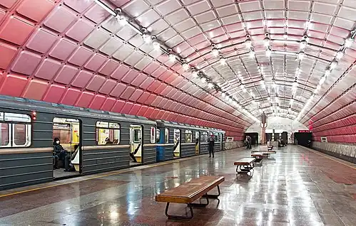 Metrobudivnykiv (Ukrainian: Метробудівників) is a station on Dnipro Metro's Tsentralno–Zavodska Line. It is a single-vault deep subway station, accessible by escalator and was opened on 29 December 1995. The station has a total of 3 exits, each of which leads to the corner of Serhiy Nigoyan Avenue and Ivan Mazepa Avenue. The station is named Metrobudivnykiv for the subway builders of the city.