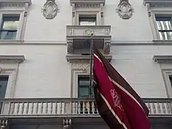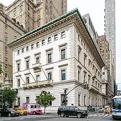 The site has a frontage of 100 feet (30 m) on Fifth Avenue and 200 feet (61 m) on 60th Street, at the northeast corner of these two streets.[32] It faces Central Park and Grand Army Plaza to the west,[3][12][185] the Pierre hotel to the north, and the Park Cinq building and the Sherry-Netherland hotel to the south.[186][187] Stanford White of McKim, Mead & White designed the original building[8][188] in the Italian Renaissance style.[34][185] White also designed custom-made torchères on the sidewalk outside the clubhouse.[189] The design of the clubhouse may have been patterned after various Italian palazzi,[190] as well as palazzo-style English clubhouses.[12] The east wing, erected in 1912, was designed by Ogden Codman Jr.[191][192][193]
