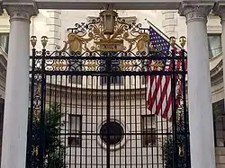 The eastern courtyard is placed behind a three-bay-wide colonnade with a central carriageway flanked by two pedestrian entrances.[185][199] This colonnade is 34 feet (10 m) tall[188] and consists of pairs of marble columns supporting an entablature.[200][201] There was originally a third column in front of each pair, but they were removed when 60th Street was widened in 1922. The western and eastern ends of the colonnade are supported by square piers.[201] Between each set of columns are wrought-iron gates designed by John Williams, a former employee of Tiffany & Co.[190][200][202]
