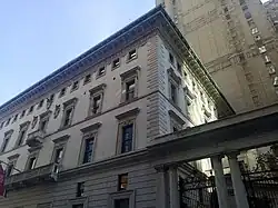The club's only surviving original trustee, Charles Lanier, agreed in 1909 to transfer ownership of the clubhouse to a new board of trustees.[84] Morton remained the club's president until November 1911, when Frank K. Sturgis took over as the Metropolitan's third president.[71] The Metropolitan bought the house at 11 East 60th Street from McGowan the same month.[81][85] J.P. Morgan & Co. provided $165,000 to finance the club's acquisition of 11 East 60th Street,[86] and the club hired Ogden Codman Jr. to renovate that house.[86][87] Codman expanded the clubhouse into 11 East 60th Street's rear yard, and he removed that building's entrance stoop.[87] In addition, the club borrowed $25,000 at the end of 1912 to pay for additional events at the clubhouse.[88] Simultaneously, the Brooklyn Rapid Transit Company (BRT) was planning to build a New York City Subway station at Fifth Avenue–59th Street, next to the clubhouse.[86][89] The Metropolitan's members initially opposed a subway entrance next to the clubhouse[90] but ultimately agreed to give the BRT an easement to build the subway entrance.[86] The subway station opened in 1919.[91]