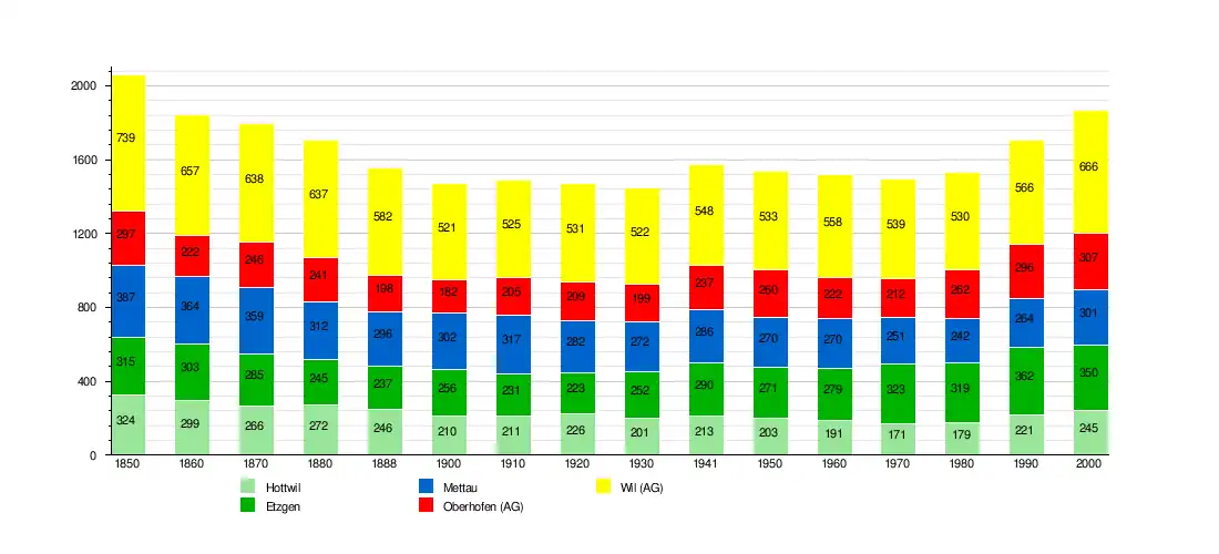 Mettauertal has a population (as of December 2020) of 2,067.[6] As of 2013, 11.3% of the population are resident foreign nationals. Over the last 3 years (2010-2013) the population has changed at a rate of -1.39%. The birth rate in the municipality, in 2013, was 9.4 while the death rate was 5.2 per thousand residents.[5]