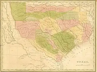 The first empresarial grant had been made under Spanish control to Stephen F. Austin, whose settlers, known as the Old Three Hundred, settled along the Brazos River in 1822. The grant was later ratified by the Mexican government, which also authorized additional, similar concessions for colonization.[2] Twenty-three other empresarios brought settlers to the state, the majority coming from the American South, while only one colony was settled by Mexican nationals, and two by European immigrants.