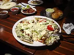 The ability to cook well, called "sazón" (lit. seasoning) is considered to be a gift generally gained from experience and a sense of commitment to the diners.[31] For the Day of the Dead festival, foods such as tamales and mole are set out on altars and it is believed that the visiting dead relatives eat the essence of the food. If eaten afterwards by the living it is considered to be tasteless.[30] In central Mexico, the main festival foods are mole, barbacoa, carnitas and mixiotes. They are often prepared to feed hundreds of guests, requiring groups of cooks. The cooking is part of the social custom meant to bind families and communities.[32]