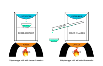 Filipino-type are very distinct from the more complex European-type alembic stills (derived from Arabic and Middle Eastern stills). They were cheap and easy to manufacture, though less efficient than alembic-type stills. They were made of a mixture of different easy-to-acquire materials. They usually consist of a hollowed-out log (usually from the parota tree) with two copper or iron pans. These were often substituted with larger capacity earthenware jars and bowls, bound wooden staves, or even metal cylinders. The upper pan is continually filled with cold water and functions as the condenser; while the bottom pan holds the fermented juice over the furnace, functioning as the boiler. The distillate is collected either by an internal container placed in between the two pans on a platform; or a spoon-shaped collector and gutter made from wood, rolled agave leaf, or carrizo cane (originally bamboo in the Philippines) that exits from the hollow log in between the pans to an external clay container. A modified version of this, usually called "olla de barro" (lit. "clay pot"), use a specially-shaped clay vessel (or overlapped clay vessels) built into a furnace as the boiler chamber (doing away with the hollow log and the bottom pan). It only uses one pan (the condenser), but otherwise operates on the same principle.[6] There are also many other modified variants, usually named after the indigenous peoples that use them, including the "Tarascan still" (or "Tarasco still"), "Zapoteco still", "Nahua still", "Bolaños still", and "Huichol still" (the latter used for making sotol, not mezcal).[9][8][10][4] Filipino-type stills are also still referred to by mezcal and tequila manufacturers (especially in Jalisco and Michoacán) as the "Filipino still" (destilador Filipino).[11]