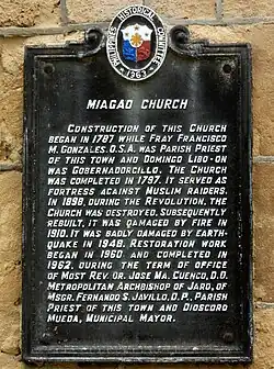 Miagao was formerly a visita (a locality served by a visiting priest) of Oton until 1580, Tigbauan until 1592, San Joaquín until 1703 and Guimbal until 1731.[3] It became an independent parish of the Augustinians in 1731 under the advocacy of Saint Thomas of Villanova.[2] With the establishment of the parish, a church and convent was built on land near the sea called Ubos. Father Fernando Camporredondo served as the town's first parish priest in 1734. When the town experienced frequent Moro invasion in 1741 and 1754, the town moved to a more secure place. From there, a new church was constructed in 1787 through forced labor under the supervision of Fray Francisco Gonzales, parish priest and Spanish gobernadorcillo Domingo Libo-on.[4] It was built on the highest point of the town to guard from invaders called Tacas. After ten years, the church was completed in 1797. It was designed with thick walls to serve as protection from invaders. It was severely damaged during the Spanish revolution in 1898 but was later rebuilt, fire in 1910, the second World War and earthquake in 1948.[4] The present church is the third structure built since its establishment in 1731.[5] To preserve the church, it underwent restoration in 1960. This was completed in 1962. The church was declared a national shrine by President Ferdinand Marcos through Presidential Decree No. 260 on August 1, 1973.[6]