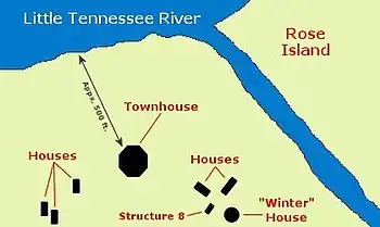 According to ethnologist James Mooney, the term "Mialoquo" comes from the Cherokee word for "Great Island."[1] This name refers to the village's situation on and adjacent to what is now known as Rose Island which was the largest island in the Little Tennessee River before the creation of Tellico Lake. Mialoquo doesn't enter the historical record until 1761, when it appeared on Henry Timberlake's "Draught of the Cherokee Country." Timberlake—visiting the Overhill settlements as a peace emissary—reported 18 houses at Mialoquo, both on the mainland and Rose Island, but doesn't indicate the existence of a townhouse. Timberlake reported 24 Overhill Cherokee warriors residing at Mialoquo under the governorship of Attakullakulla, who at the time was the chief of the nearby village of Tuskegee. Since the Cherokee didn't consider a village a "town" unless it had a townhouse, the lack of a townhouse at Mialoquo may have been the reason for its relatively late appearance in historical records.[2]