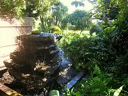 Outside the offices is a refurbished fountain designed by Morris Lapidus. Beyond the fountain is the main pond with a cascading oolite fountain and flowering water lilies. The adjoining wetland contains red mangroves, pond apple trees (Annona glabra), and rush grasses. During the day you can see dragonflies, koi, and if you're lucky, one very shy turtle roaming the waters.[2]