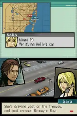 Miami Law is a point-and-click adventure game where players must gather clues, read text, and become involved in the story in order to solve mysteries and move the plot forward.[3] The game uses a mixture of three-dimensional computer graphics for action sequences and two-dimensional character images for story scenes. Players are given the choice of assuming the role of either Law Martin, whose scenarios largely involve action scenes such as car chases and shoot-outs, or Sara Starling, who primarily uses puzzle-based gameplay such as analyzing clues and compiling evidence.[4] A player is given the opportunity to switch between characters at certain points in the game's story, with the plot being affected by which character is used at different points in the narrative.[4] In addition to normal gameplay elements, Miami Law also includes minigames such as Sudoku and Texas hold 'em that can be accessed after the player has fulfilled certain requirements during the main game.[4]