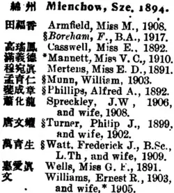 - ^ Qin, Heping; Shen, Xiaohu, eds. (2008). 四川基督教资料辑要 [A Collection of Historical Documents on Christianity in Sichuan] (in Simplified Chinese). Chengdu: Bashu Publishing House. pp. 236–237. ISBN 978-7-80752-226-3.