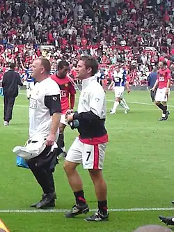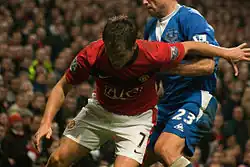 Owen scored his first goal for United on his debut, scoring an 84th-minute winner after coming on as a substitute in a pre-season friendly against a Malaysian XI;[109] he followed this up by scoring three more goals in United's pre-season games.[110][111] Owen made his league debut for United when he came on as a substitute against Birmingham City on 16 August in a 1–0 win,[112] and scored his first competitive goal in a Manchester United shirt against Wigan Athletic on 22 August in a 5–0 away win.[113] On 20 September, Owen scored his first goal at Old Trafford, in the sixth minute of stoppage time against local rivals Manchester City to give United a 4–3 derby win. This meant that Owen had now scored in his third derby, after scoring in the Merseyside derby, and the Tyne–Wear derby in previous years.[114] Owen struggled to recall the moments immediately after the goal, and said that it ranked as one of his most important.[115] On 27 October, Owen scored a goal in the 2–0 away win against Barnsley to qualify United past the fourth round of the League Cup. On 3 November, Owen scored his first Champions League goal for Manchester United, as he grabbed United's first in the 3–3 draw against CSKA Moscow.[116] Owen's seemingly slim chances of earning a place in Fabio Capello's England squad for the 2010 World Cup finals in 2010 received a boost when on 8 December 2009, Owen scored his first hat-trick for Manchester United in a 3–1 away win against VfL Wolfsburg in the Champions League, his first hat-trick since 2005.[117] On 28 February 2010, Owen scored United's first goal in their 2–1 victory over Aston Villa in the 2010 League Cup final, but had to be substituted after pulling up on 42 minutes. Originally thought to be a minor injury, on 5 March it was announced Owen required surgery on his hamstring, ruling him out for the rest of the season.[118]