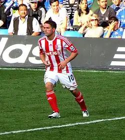 On 4 September 2012, Owen joined Stoke City on a one-year contract.[129] He was handed the number 10 shirt from the departed Ricardo Fuller and made his debut in a 1–1 draw against Manchester City on 15 September.[130] The start to his time at Stoke was hampered by a hamstring injury.[131] Owen scored his first and only goal for Stoke on 19 January 2013 in a 3–1 defeat at Swansea City, his first goal since 25 October 2011. In doing so, he became only the seventh player to reach 150 Premier League goals.[132]