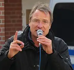 Stürzenberger was elected leader of the German Freedom Party after René Stadtkewitz resigned in 2013, and held the position until 2016 when the party was dissolved in favour of the Alternative for Germany (AfD).[17] He ran for local elections in Munich-Bogenhausen in 2013, receiving 0.4% of the vote.[18] He ran for lord mayor elections in Munich in 2014, and would speak in the public square almost every day.[19] He received 0.5% of the vote in the election.[20]
