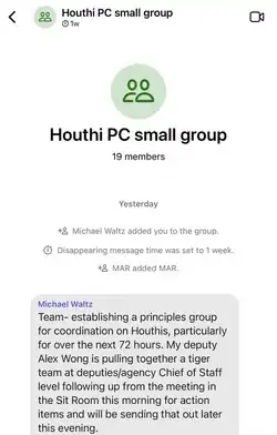 - ^ Fields, Ashleigh (March 25, 2025). "Waltz questions how Atlantic editor 'somehow' got 'sucked into' Signal chat". The Hill. Retrieved March 28, 2025.