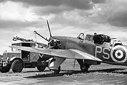By November 1939, Young was a pilot officer on probation and was serving with No. 264 Squadron.[1][2] This was a newly formed unit that was stationed at Martlesham Heath and working up with the new Boulton Paul Defiant turret fighter. By March 1940, the squadron's personnel had largely overcome the initial issues experienced with the Defiant and it was operational, doing patrol work along the English coast.[3] Young had been confirmed in his pilot officer rank by this time, and was paired with Leading Aircraftsman Stanley Johnson as his gunner.[4]
