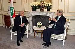 Michel Suleiman (Arabic: ميشال سليمان [miːˈʃæːl sʊleːˈmæːn]; born 21 November 1948) is a Lebanese politician who served as the 12th president of Lebanon from 2008 to 2014. Before becoming president, he served as commander of the Lebanese Armed Forces from 1998 to 2008.[1]
