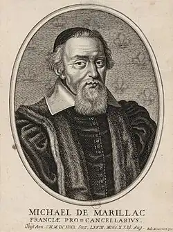 Michel de Marillac (October 1563 in Paris – 7 August 1632 in Château de Châteaudun) was a French jurist and counsellor at the court of Louis XIII of France, one of the leading dévots. His uncle was Charles de Marillac, Archbishop of Vienne and a member of the king's council, the Conseil du Roi. A member of the circle of Marie de' Medici, he was arrested after the Queen Mother's flight in 1631 and died in prison.