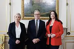 O'Neill automatically relinquished her office following Paul Givan's resignation as first minister on 3 February 2022.[8] Sinn Féin became the largest party after the 2022 Assembly election, putting O'Neill in line for the position of First Minister of Northern Ireland; however she did not take up the position until two years later because the Democratic Unionist Party (DUP) refused to nominate a deputy First Minister, citing its opposition to the Northern Ireland Protocol. On 3 February 2024, O'Neill was appointed First Minister of Northern Ireland. This marked the first time that an Irish nationalist had held the title of First Minister in Northern Ireland.[b]