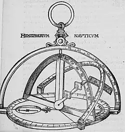 Strongly encouraged by Gillis Hooftman[12] in 1580 Coignet published a treatise on navigation entitled Nieuwe Onderwijsinghe op de principaelste Puncten der Zeevaert ('New Instructions on the Principal Points of Navigation'). It was published by the Antwerp publisher Hendrik Hendriksen as an appendix to the Dutch-language translation of Pedro de Medina's Arte de Navegar.[13] In the appendix he pointed to the possibility of determining longitude at sea with watches on the ships. He also described some of his newly invented instruments such as the nautical hemisphere.[14] The nautical hemisphere is an instrument with which the longitude problem could, in theory, be solved. In 2008 an example of this instrument, likely made in Coignet's workshop, surfaced during an exhibition on the history of the Jesuit Seminary of Tournai.[15]
