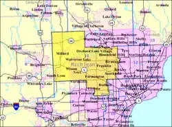 - Auburn Hills, Berkley, Birmingham, Bloomfield Hills, Bloomfield Township, Clawson, Commerce Charter Township, Novi (part; also 6th), Farmington, Farmington Hills, Ferndale, Hazel Park, Huntington Woods, Keego Harbor, Lake Angelus, Madison Heights, Oak Park, Orchard Lake Village, Pleasant Ridge, Pontiac, Royal Oak, Royal Oak Charter Township, Sylvan Lake, Troy, Walled Lake, Waterford Charter Township, West Bloomfield Charter Township, White Lake Charter Township (part; also 9th), Wolverine Lake, Wixom