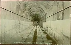 Construction began in October 1906 under the engineering supervision of the New York Central Railway's engineering vice president, William J. Wilgus. Dredging to construct the tunnel was performed in part by Dunbar & Sullivan, who used a steel dredge (Tipperary Boy) to carry out the work.[1] The Michigan Central Railway Tunnel opened for passenger service July 26, 1910. Freight service began September 15 and on October 16 all traffic began running via the tunnel, ending the use of a train car ferry. From opening it was operated by the Michigan Central Railroad under lease of December 19, 1906. It was the first immersed tube tunnel to carry traffic.