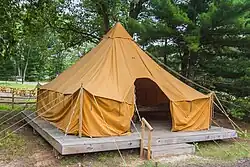 The Civilian Conservation Corps camp representation of a 1933 CCC tent was near the Michigan farmhouse at the end of the half-mile park tour. Groups of young people that wanted to work as park volunteers would work with the park staff from here. Some attendees that didn't especially want to be volunteers may be recruited also.[19]