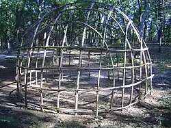 When the park reconstructed their two reproductions it was learned that there was much more labor and technology involved that had not been originally anticipated. The wigwams built by the park did not have the center smoke hole as the Native Americans would have constructed. They would have had an internal fire for warmth and cooking, and the smoke needed a path to escape the inside of their dwelling. The park used jute and metal rebar to build their two wigwams for durability since they are display model reproductions and not residences. The two wigwams that the park built were about 12 by 15 feet (3.7 by 4.6 m) at the base.[28]