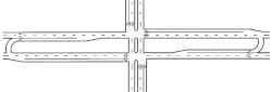 Similarly, traffic on the divided highway cannot turn left at an intersection with a cross street. Instead, drivers are instructed to "overshoot" the intersection, go through the U-turn lane, come back to the intersection from the opposite direction, and turn right.