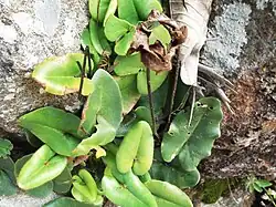 The nomenclature and taxonomy of the species is somewhat tangled. A species of fern native to the Indian subcontinent and other parts of tropical Asia was described in 1828 as Hemionitis cordata.[5] This name was later considered to be a (heterotypic) synonym of Hemionitis arifolia. As this was an older name, being based on Asplenium arifolium published in 1768, the species was known as Hemionitis arifolia. In 1974, John T. Mickel considered that the species he called Hemionitis arifolia might be sufficiently different from the other (American) species placed in Hemionitis to require a new genus. The differences included frond morphology and which flavonoids were present.[6] Molecular phylogenetic studies have since confirmed the distinctiveness of the species.[7]