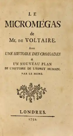 Le Micromégas is a 1752 novella by the French philosopher and satirist Voltaire.[1] Along with his story "Plato's Dream", it is an early example in the literary genre of science fiction and has its place in the development of the history of literature. Some uncertainty surrounds the first publication of Micromégas, with possible editions dating to 1751 or as early as 1739, but with the widely accepted publication being 1752.[2]