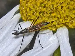 These stilt-legged flies have no crossvein separating discal cells and the second basal cell of the wing. Fronto‑orbital setaeare absent. Costa is bare from base to end of subcostal vein. Occiput is very prominent and has postvertical bristles. The four posterior tibiae have small bristles.[2]