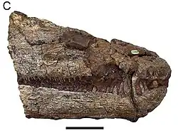 Exoccipital condyles were present with a large, rounded outlining.[1] The paroccipital processes were attached to each condyle but were barely preserved in the specimen.[1] A single, large paraquadrate foramen was seen near the posterolateral margin of the skull.[1]