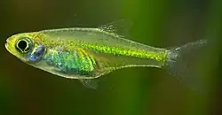 In the aquarium fish trade, it is often identified as the "yellow neon" or "green neon" rasbora.