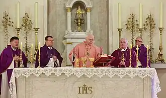In Roman Catholic, Anglican, Lutheran and Old Catholic churches flowers may appear on the high altar and the organ may be played as a solo instrument. Priests are given the option to wear rose-colored vestments at Mass held on this day in place of the violet vestments normally worn during Lent.[10] The term "rose" is used to describe this lighter shade of the color violet in the Roman Rite.[11]
